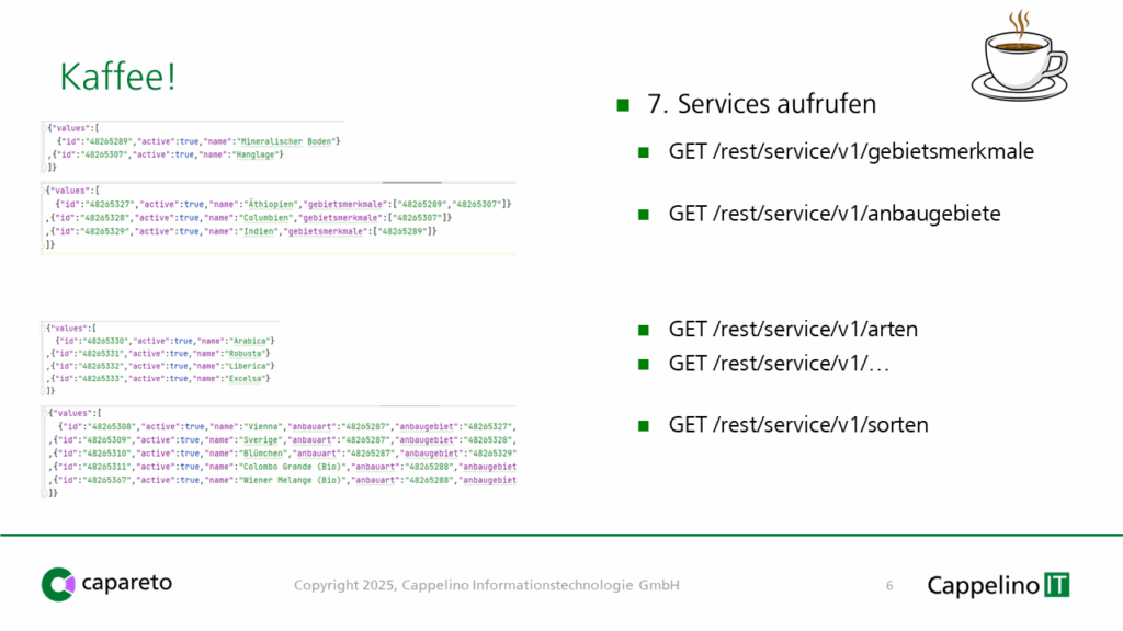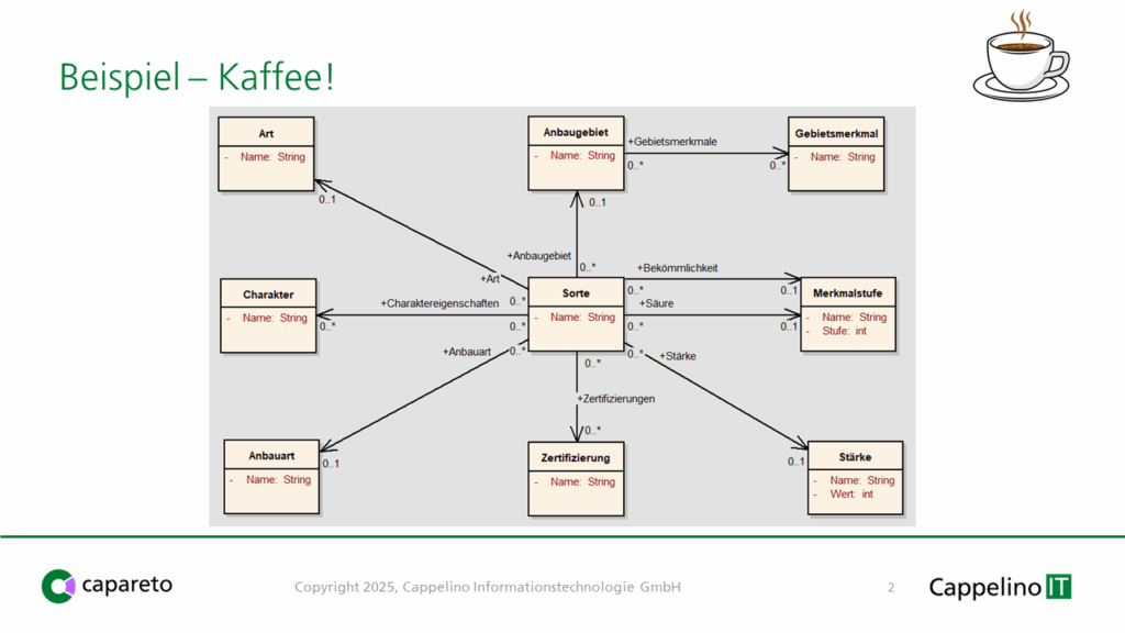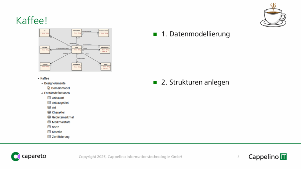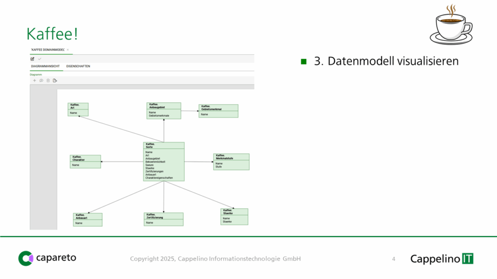 Bei der „Cappuccino AG“ herrscht Chaos in den Produktdaten. Um Ordnung zu schaffen, werden in einem Workshop die Beziehungen der Stammdaten besprochen und visualisiert. Jetzt müssen nur noch die Geschäftsobjekte als Entitäten angelegt werden. Dann kann bereits die Fachabteilung die Daten erfassen und bearbeiten. Aus einer externen Quelle lassen sich Daten automatisch importieren. Im letzten Schritt werden die Daten online anderen Systemen über REST Services bereitgestellt.